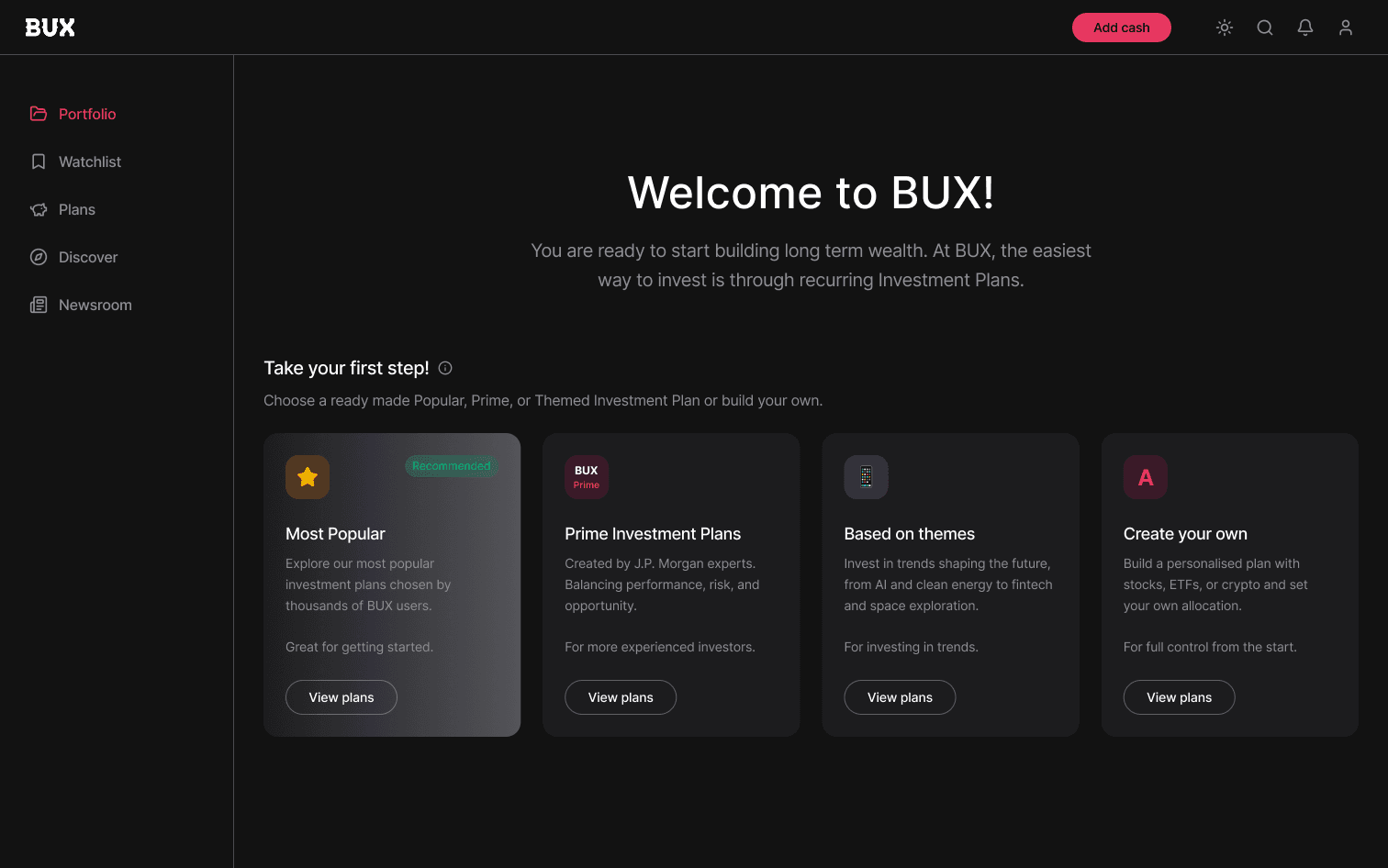 BUX is a European retail investing platform. Investment Plans, a recurring investing feature, already existed on mobile. The web platform supported onboarding, discovery, and trading, but recurring investing was absent entirely. This project was a zero-to-one expansion: bringing Investment Plans to desktop, designed from scratch in seven days.