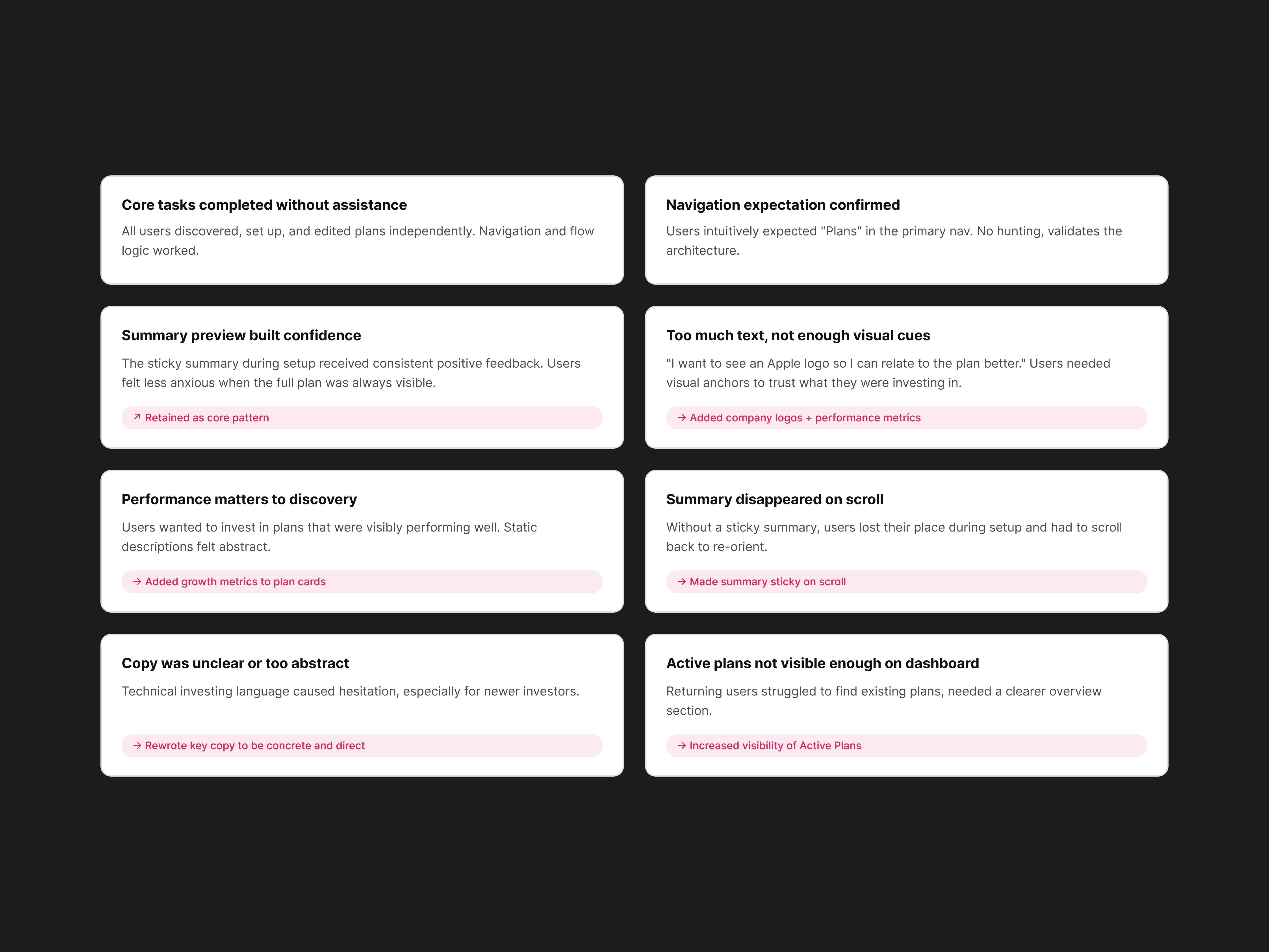 Clear overview cards (so users can assess performance)