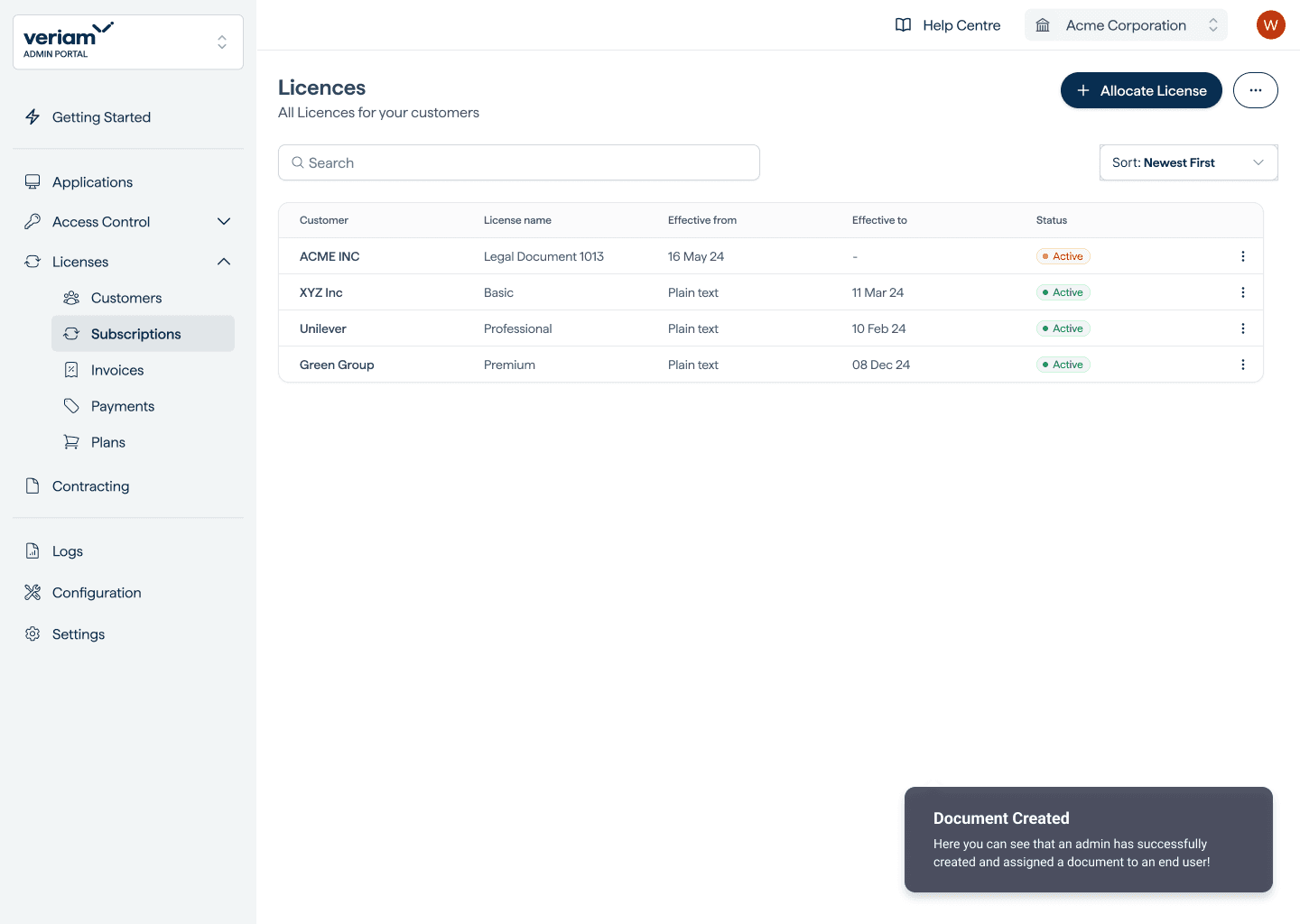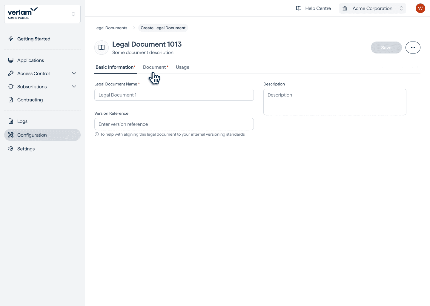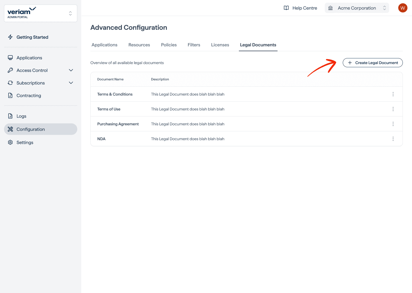 Veriam (previously Metrics Matter) is a newly formed SaaS company focusing on Identity and Access Management, Licensing, Billing, Contracting and Payments. Assigned legal documents grant access and permissions to view particular data. In order to do this, the legal documents need to be added and managed by a Service Provider and accepted by a Service Consumer.
