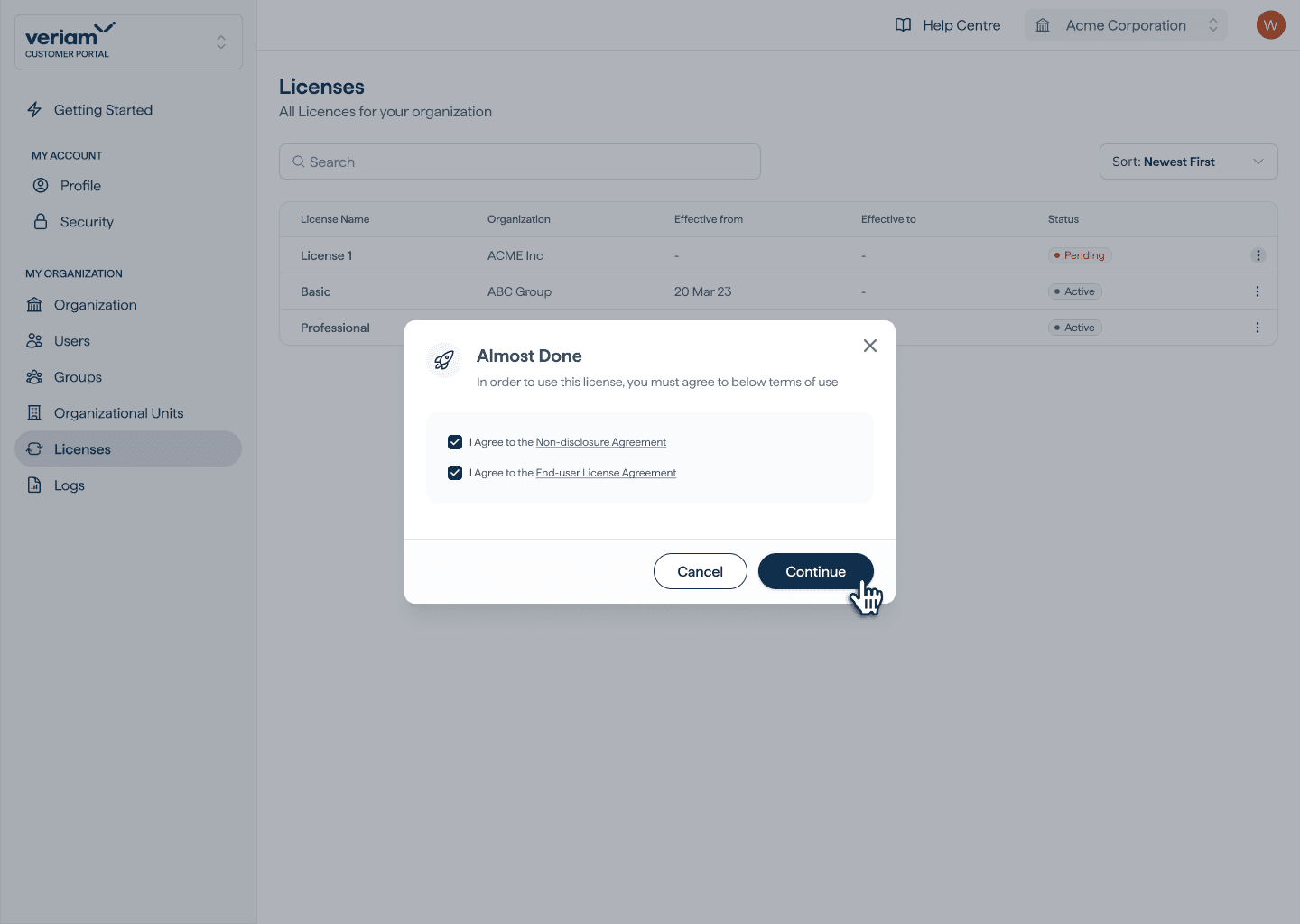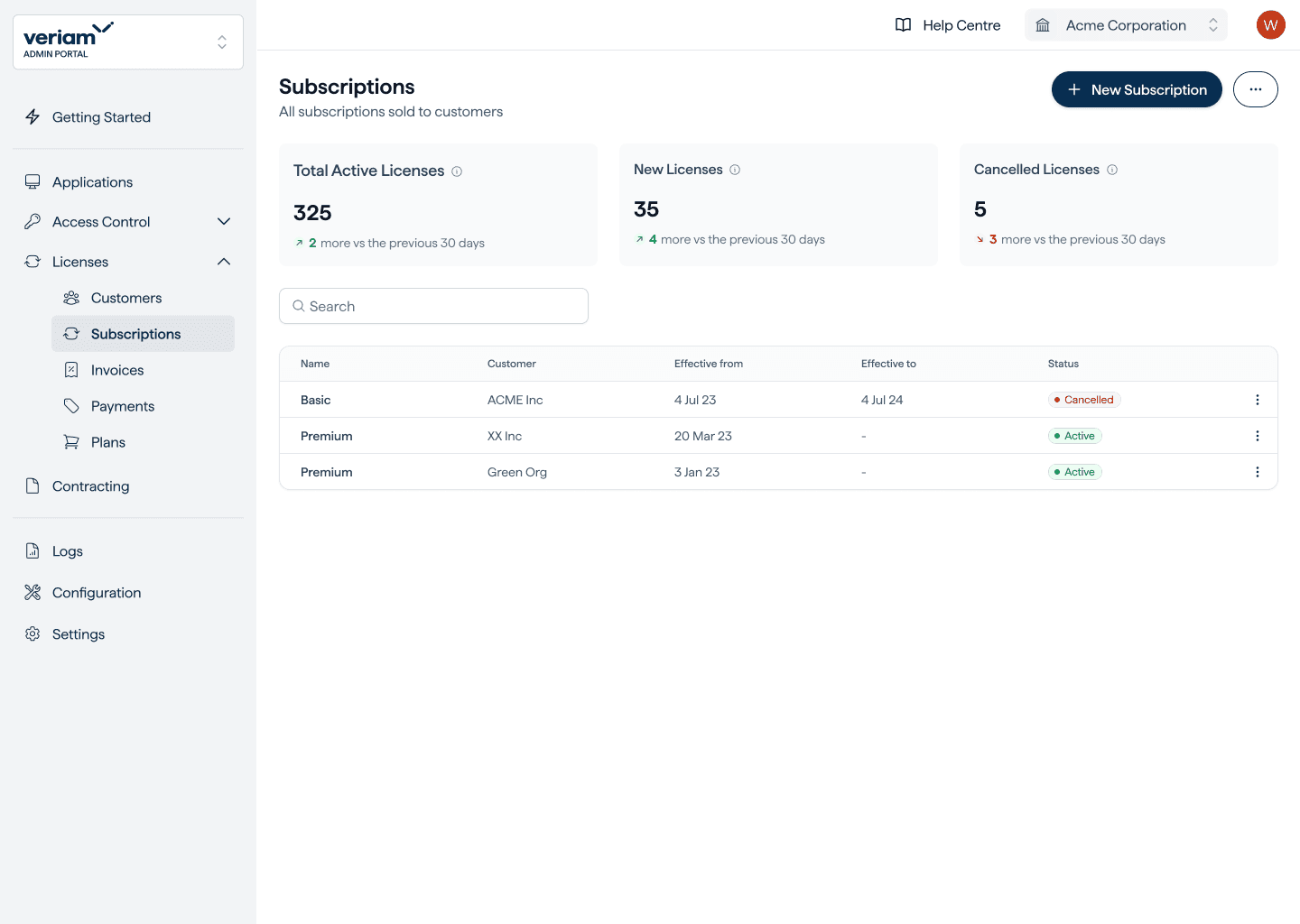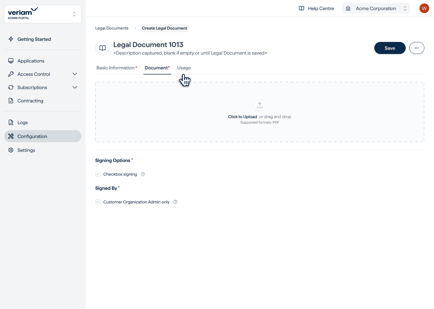 Veriam (previously Metrics Matter) is a newly formed SaaS company focusing on Identity and Access Management, Licensing, Billing, Contracting and Payments. Assigned legal documents grant access and permissions to view particular data. In order to do this, the legal documents need to be added and managed by a Service Provider and accepted by a Service Consumer.
